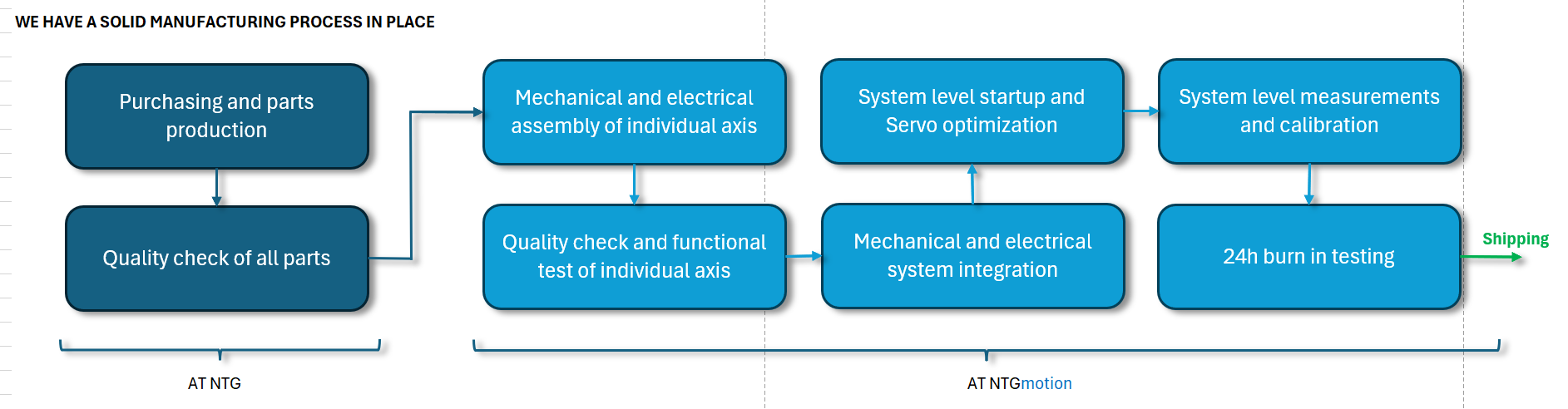 A large variety of machines including big machining centres allow production of high precision linear axis up to 4.6m of travel and offer a wide range of possibilities to produce all the parts we need. NTG`s machining facilities are prepared to ramp up production for higher quantities if needed.
